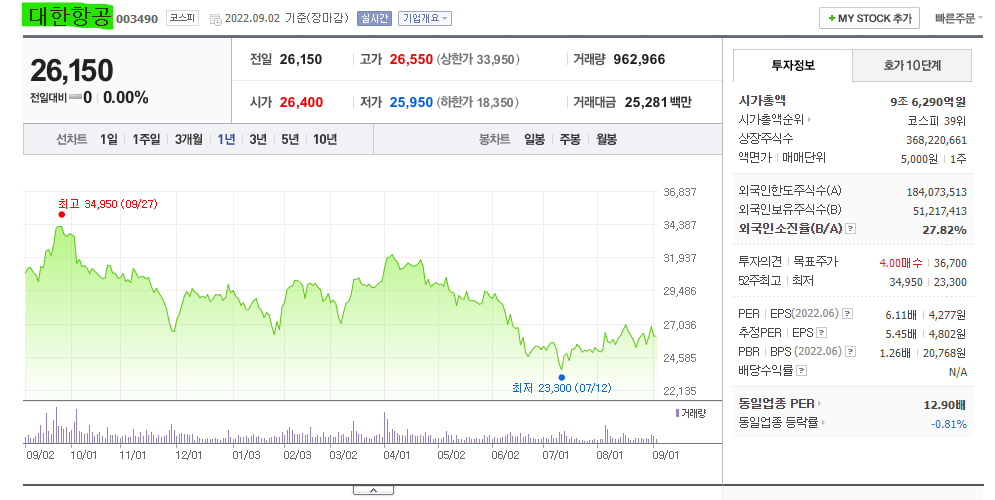 대한항공 주가, 대한항공 주식시세
