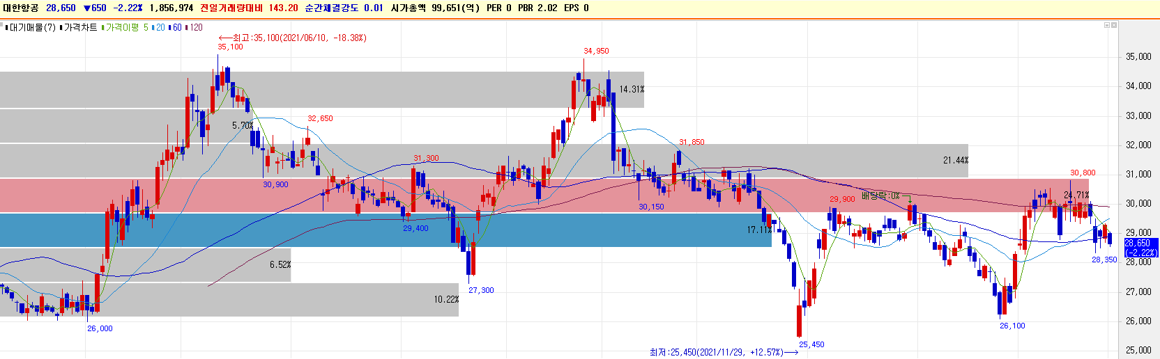 언제부터 투자했는지 잘 기억나지 않지만 지금은 거의 방치 수준이다. 하하하. 대한항공 주가 차트를 봐도 전고가 20,400원, 전고가 32000원…1년 동안에도 1만원 이상의 변동성을 보이고 있는데 언제쯤 주가는 내 평단가로 돌아올까.