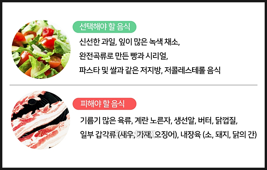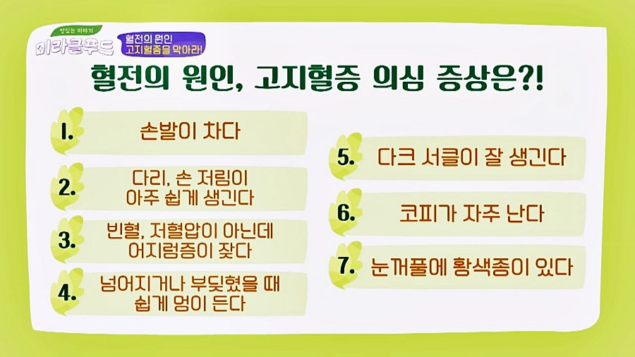 이상 지질 혈증에 피해야 하는 나쁜 음식은 육류유, 크림, 라면, 마가린, 과자, 아이스크림 등입니다. 콜레스테롤이 많은 동물의 간도 피해야 합니다. 대신 야채와 과일, 정제되지 않은 곡물, 불포화 지방산이 많은 올리브 오일 등 등푸른 생선 등을 먹도록 합니다. 특히 호두, 아몬드 등의 견과류는 불포화 지방이 많이 함유되어 있어 콜레스테롤을 낮추는 역할을 합니다. 카레의 주원료인 ‘강황’도 고지혈증 예방에 좋습니다. 강황 중의 커큐민 성분은 중성 지방과 콜레스테롤 수치를 낮추고 콜레스테롤이 혈관에 쌓이는 것을 방지합니다.