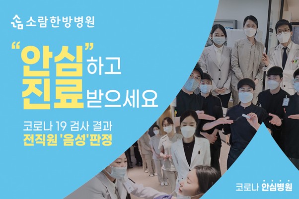 월 1회 바이러스방역 전문업체 세스코를 통해 신관과 본관 전체 건물에 살균방역 작업을 실시하며 로비, 엘리베이터 등 다중이용시설 문손잡이, 소파 등을 대상으로 일 2회 소독작업을 실시하고 있어 내원의 걱정을 덜어줄 수 있습니다. 주말에도 상담이 가능하오니 대표번호 1661-1115로 전화주시면 친절하고 상세하게 답변드리겠습니다. 본 소람한방병원은 한방면역암치료의 선두병원으로 자리매김하기 위해 끊임없는 연구와 학술활동을 하고 있습니다. 앞으로도 늘 여러분들의 이야기를 경청하는 소인이 되겠습니다. 당신은 소중한 사람입니다♥