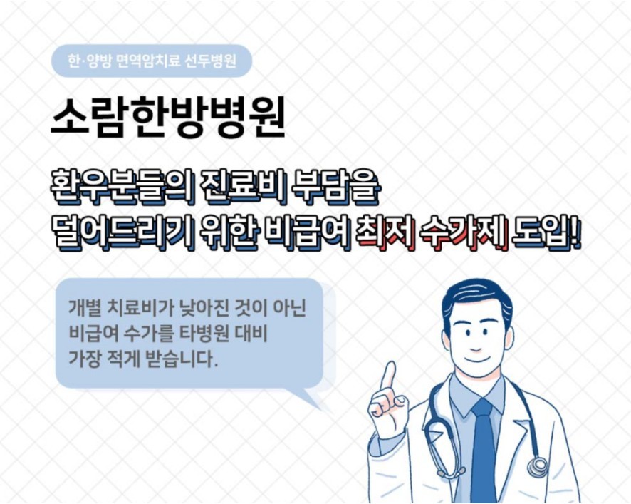 또한 본 병원은 환자 및 보호자 여러분이 가지고 있는 치료에 대한 경제적 부담을 덜어주기 위하여 비급여최저수가제를 도입하였습니다. 같은 치료 방법이나 약물 등을 기존보다 저비용으로 받을 수 있기 때문에 안심하십시오.