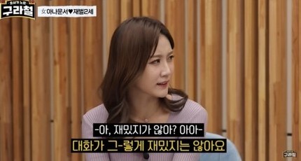 이에 더해 김도연 아나운서는 “재벌 2세와 소개팅 자리를 가진 적이 있는데 대화 때 재미가 없었다.돈이 많아서 재미없다고 생각했다고 경험담을 전했다.