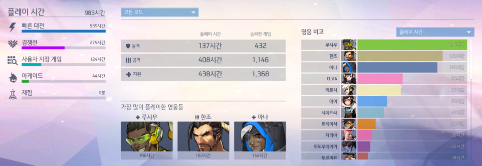 - 오버워치의 시작, 그리고 경쟁전인데 사실 저는 처음 오버워치를 했을 때는 무슨 게임인지 이해가 안 됐고 왜 이게 재미있는지 이해가 안 됐다. 다만 남자 동기들과 어울리다 보니 PC방에 가서 술을 마시고 다시 PC방에 가곤 했다. 그게 반복되다 보니 어느새 25레벨을 기록했고.하지만 경쟁을 하는 와중에도 이상한 게임이라는 생각뿐이었다. 첫 시즌에는 루시우만이 뛰어다녔다. 동기들이 내가 메르시가 너무 서툴러 디바와 루시우를 부탁했지만 디바는 자기 자리에서 힘들게 자꾸 죽었고 나는 루시우를 좋아했다. 그때 루시우가 너무 op이기도 했고 텐션도 높고 신나는 개구리 인형이 나는 너무 좋았던 것 같다. 게임인데 노래 틀고 그 노래 들으면 힐링이 된대! 콘셉트도 너무 신기하고 재밌잖아 그리고 이동기(지금도 잘하고 좋아하는 챔프는 이동기가 있는 애들이다)가 있어 죽고 합류하기까지의 과정이 빠르고 좋았다. 팀 보이스로 루시우 대사를 따라하는 것도 즐거웠고, 내 인생에서 최고로 긍정적이었던 시절이 아마 루시우에게 푹 빠져 지냈을 때라고 해도 과언이 아닐 정도였다. 그때 내가 루시우를 얼마나 했더니 챔프폭이 늘어난 지금도 본 계정의 영웅별 플레이타임은 루시우가 여전히 1위를 차지하고 있어 ㅋㅋㅋㅋㅋㅋㅋㅋㅋㅋㅋㅋㅋㅋㅋㅋㅋㅋㅋㅋㅋㅋㅋㅋㅋㅋㅋㅋㅋㅋㅋㅋㅋㅋㅋㅋㅋㅋㅋㅋㅋㅋㅋㅋㅋㅋㅋㅋㅋㅋㅋㅋㅋㅋㅋㅋㅋㅋㅋㅋㅋㅋㅋㅋㅋㅋㅋㅋㅋㅋㅋㅋㅋㅋㅋ