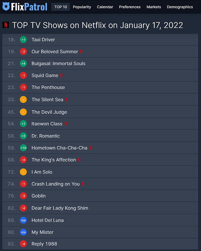 · 모범택시 (Taxi Driver) : 18위 · 그 해의 우리들 (Our Beloved Summer) : 19위 · 불가살 (Bulgasal : Immortal Souls) : 21위 · 이카게임 (Squid Game) : 22위 · 펜트하우스 3 (The Penthouse) : 23위 · 고모부답 : 23위 · 숙부답 : 22위 · 숙부답 : 23위 · 숙부답 : 23위 · 숙부답 : 23위 · 숙부답1988(Reply 1988):92위