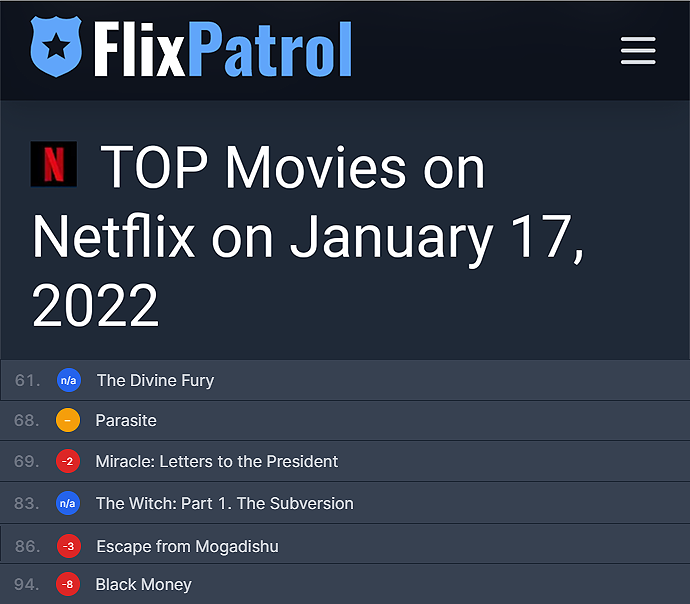 넷플릭스 영화 인기 순위에서 1월 13일 개봉한 미국의 범죄 스릴러 ‘브레이즌(Brazen, 2022)’이 IMDb 평점 3.9에도 불구하고 ‘Dont Look Up’을 제치고 1위에 올랐으나, 한국 영화는 2019년 박서준, 안성기 주연의 ‘사자(The Divine Fury)’가 차지했다.그리고 ‘모가디슈(Escape from Mogadishu)’가 86위, 2019년 조진웅, 이하늬 주연의 ‘검은 돈(Black Money)’이 94위에 올랐다.