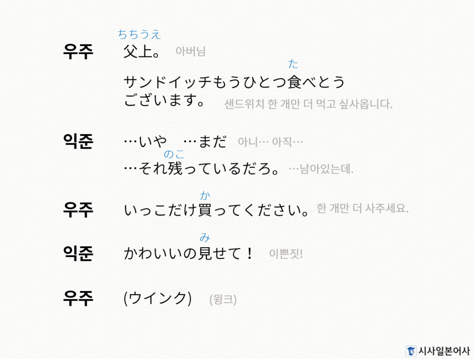 슬기로운 의사생활의 5인조 중 하나인 익준과 아들 우주가 샌드위치 가게에서 나누는 대화 내용입니다. 기억 잘 하고 있다가 샌드위치 사달라고 조를 때! 써봅시다.