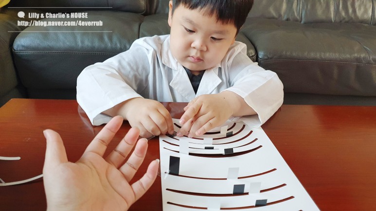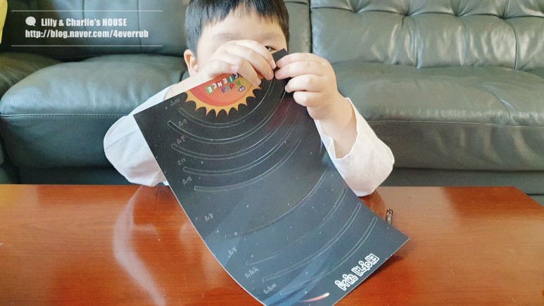 태양계를 표현하기 위해 곡선이 얇은 두께로 열려 있습니다. 저 부분에 움직일 수 있도록 태양의 행성을 키워 놓은 키트입니다.혼자 할 수 있을까 했는데 테이프 자르기만 도와주면 혼자 완성할 수 있어요.