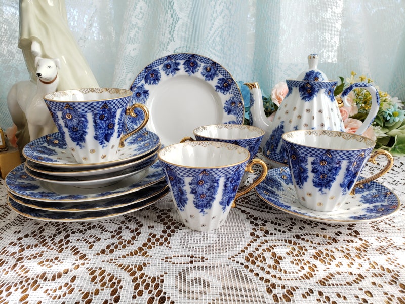 색감이 상쾌한 로모노소프의 윈딩 트위그 튤립 티팟입니다.푸른 색의 큰 꽃이 상큼한데다 골드로 장식된 작은 꽃이 고급스럽습니다. 동글동글한 모양이 귀엽고 예뻐요.600ml 용량으로 2인용이면 됩니다.러시아 연방 시대에 제작되었습니다.최상 컨디션제조국 러시아높이 12.5cm 폭 19*11.8cm \88,000