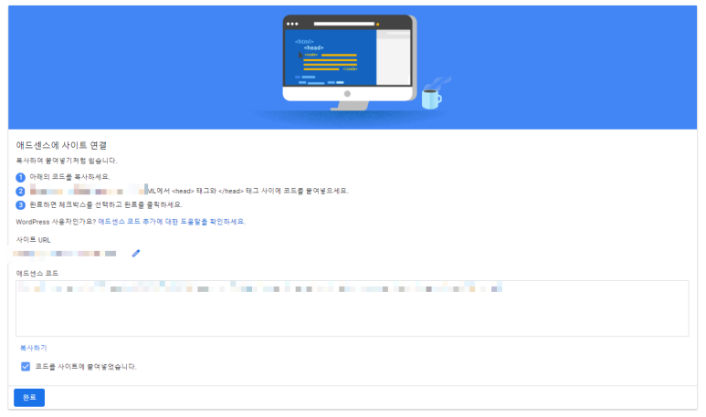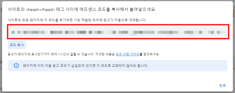 <head> </head> 사이에 <!–승인코드—>라고 잊지 않도록 주석을 붙인 후 코드를 ctrl+v해서 붙여넣고 저장했다가 어드센스 사이트로 돌아가서 코드완료를 누르면 끝입니다.