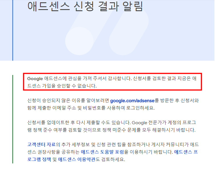 최대 2주일이 걸린다고 해서 그 동안 꾸준히 글을 쌓았는데 2주일이 지나서야 답메일이 왔는데 안타깝게도 승인을 받지 못했습니다.