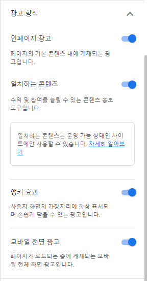 들어가면 설정이 해제되어 있기 때문에 오른쪽 하단의 연필 모양을 선택하여 자동광고를 활성화시키고 그 아래의 광고형식으로 인페이지 광고가 일치하는 콘텐츠 등 모든 것을 활성화시킨 후 사이트 적용을 클릭했습니다.