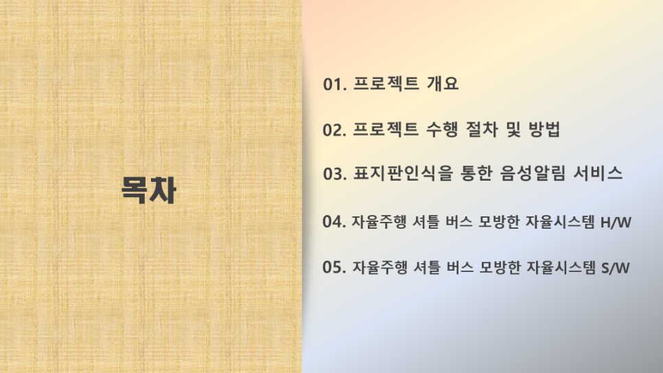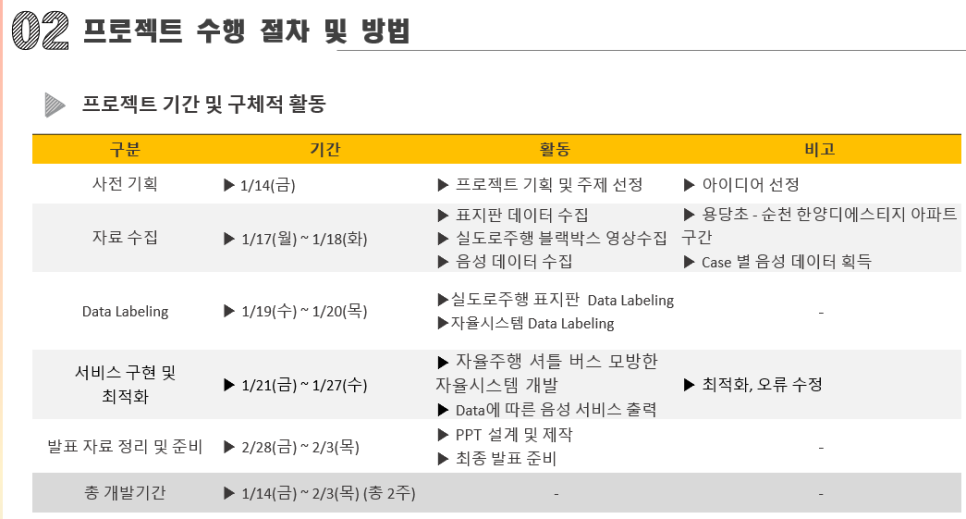 아래는 저희 병원 수료생 자율주행 카 프로젝트 샘플을 참조하시기 바랍니다.제목,목차,개요,프로젝트일정,서비스개발,특이점등의순서로생성이되면무난할것같습니다.