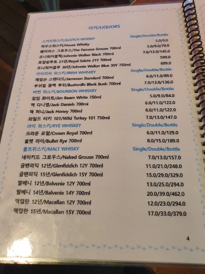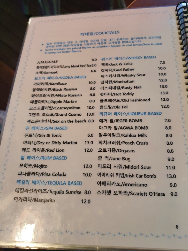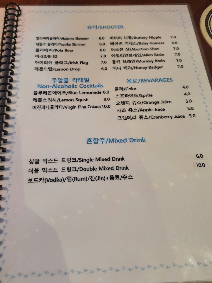 메뉴가 진짜 많아.각종 맥주에 칵테일에 보드카, 위스키, 양주까지