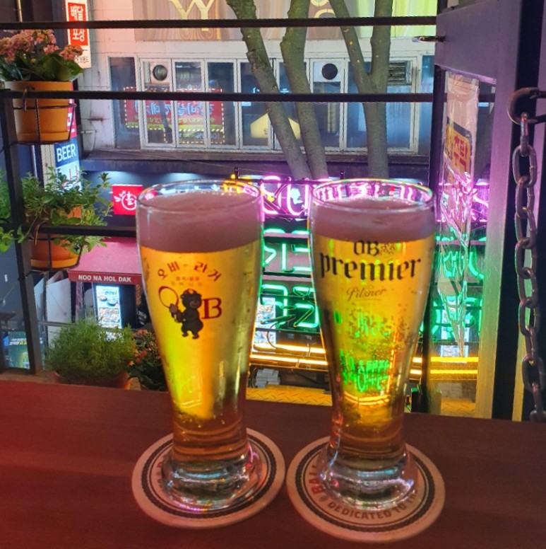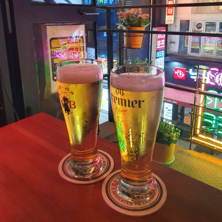 맥주 나왔다~ 세계 맥주 마셔야 될 것 같은데 저희는 저렴한 한국 맥주 주문 밖의 배경에
