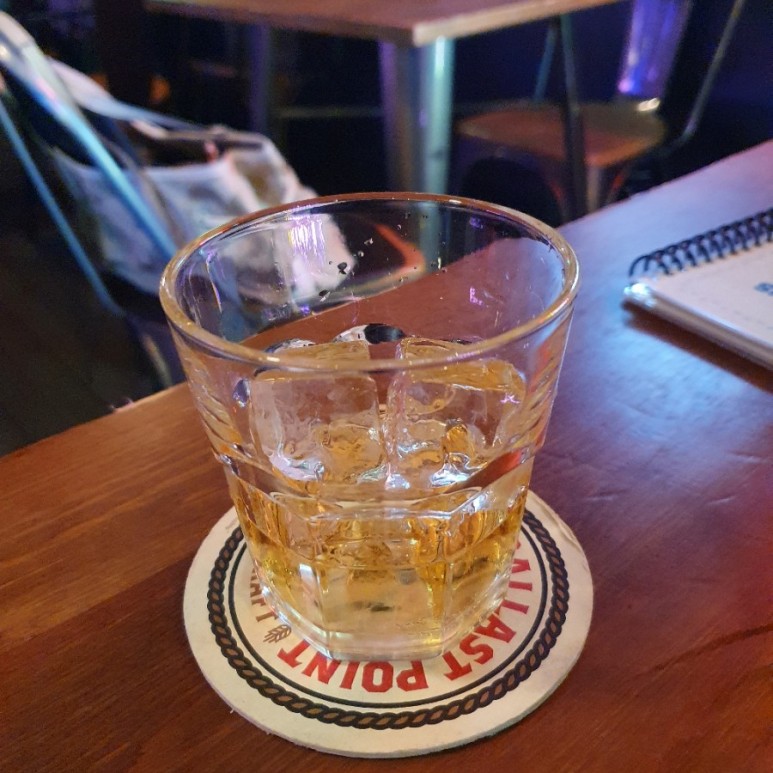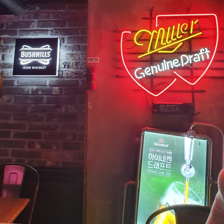 미러 네온사인도 있고 부시밀? 위스키 로고도 있는 여기서 양주샷도 팔고 언더락으로 먹을 수 있어서 좋았다