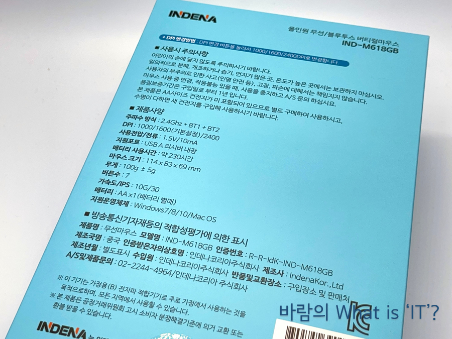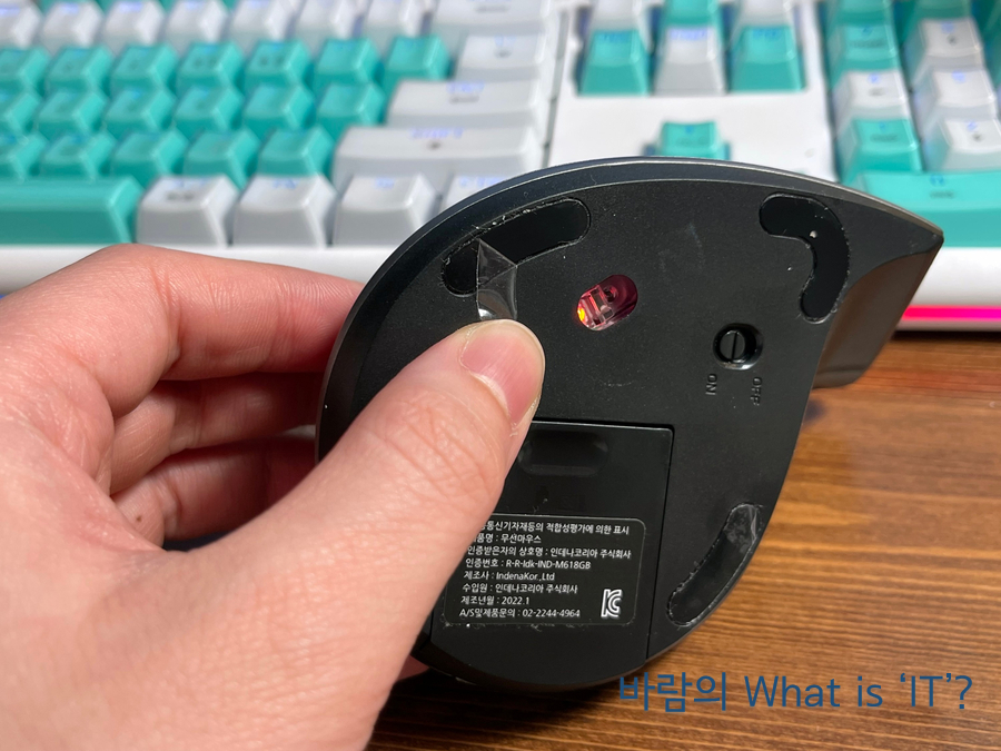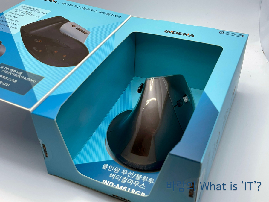 본체부터 한번 봅시다! 이름만 봐도 알겠지만 인디나의 IND-M618GB 마우스는 버티컬 마우스이고 일반적인 마우스와는 달리 오른쪽에는 마우스 클릭 버튼이 있고 왼쪽에는 기능 버튼이 있습니다.
