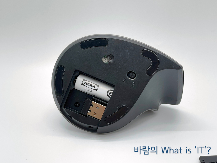 마우스 본체 하부의 커버를 제거하면 AA형 건전지를 넣을 공간이 나타납니다. 배터리 옆 자리에는 USB 리시버를 수납할 수 있는 작은 공간도 있어요. 덕분에 밖에서 사용할 때 리시버를 잃어버릴 걱정도 적네요.