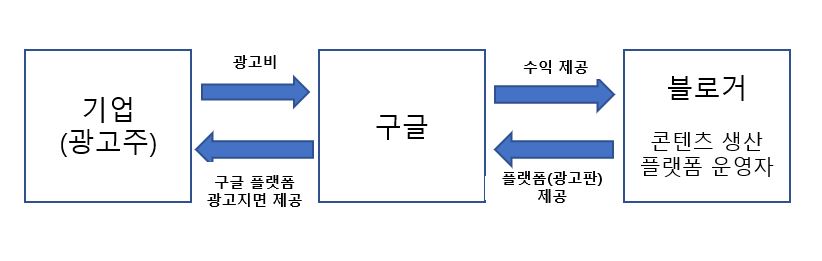 - 구글에서 전 세계 블로그 운영자에게 구글 광고를 게시할 수 있는 기회를 제공하고 광고주로부터 받은 돈을 플랫폼(블로그) 사용비로 우리에게 배분하는 구조입니다.
