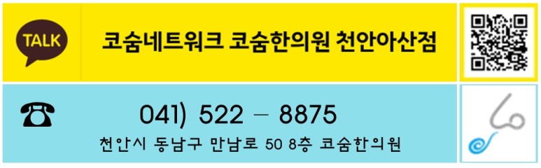 **상담 및 예약문의는 전화 또는 카카오톡을 이용해주세요** 비염, 축농증, 코골이, 수면무호흡, 후비루, 중이염, 이명, 난청, 어지럼증, 비수술치료, 코골이, 한의원, 천안아산점입니다. pf.kakao.com ☎ 041) 522-8875