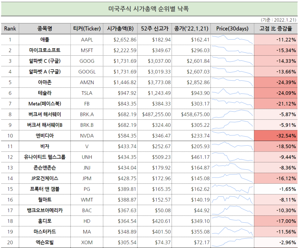 4.21년 3월에 미국주가 폭락해, 미국주 시가총액 순위별 하락폭을 구글 시트에 정리해 두었다. 이번에도 시가총액 순위별 낙폭 현황(22.1.21 기준)을 한번 정리해 봤다.