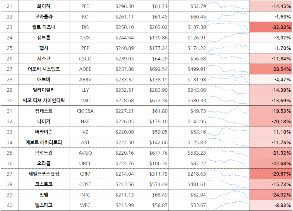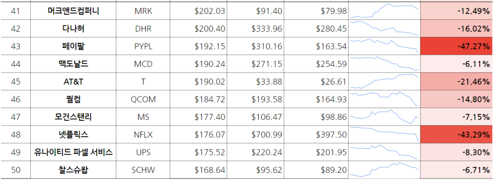 10위권 내에서 테슬라와 엔비디아 시가총액 순위의 상승이 두드러져 에너지 기업의 시가총액 상승이 두드러졌다. 어쨌든 미국의 주식 종목은 정점에 비해 적게는 1%대, 많게는 47%(위에서도 언급한 넷플릭스) 하락했다.