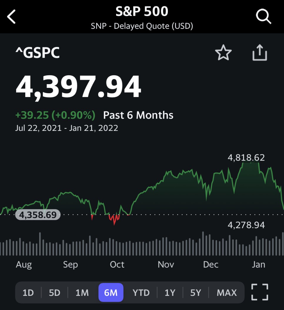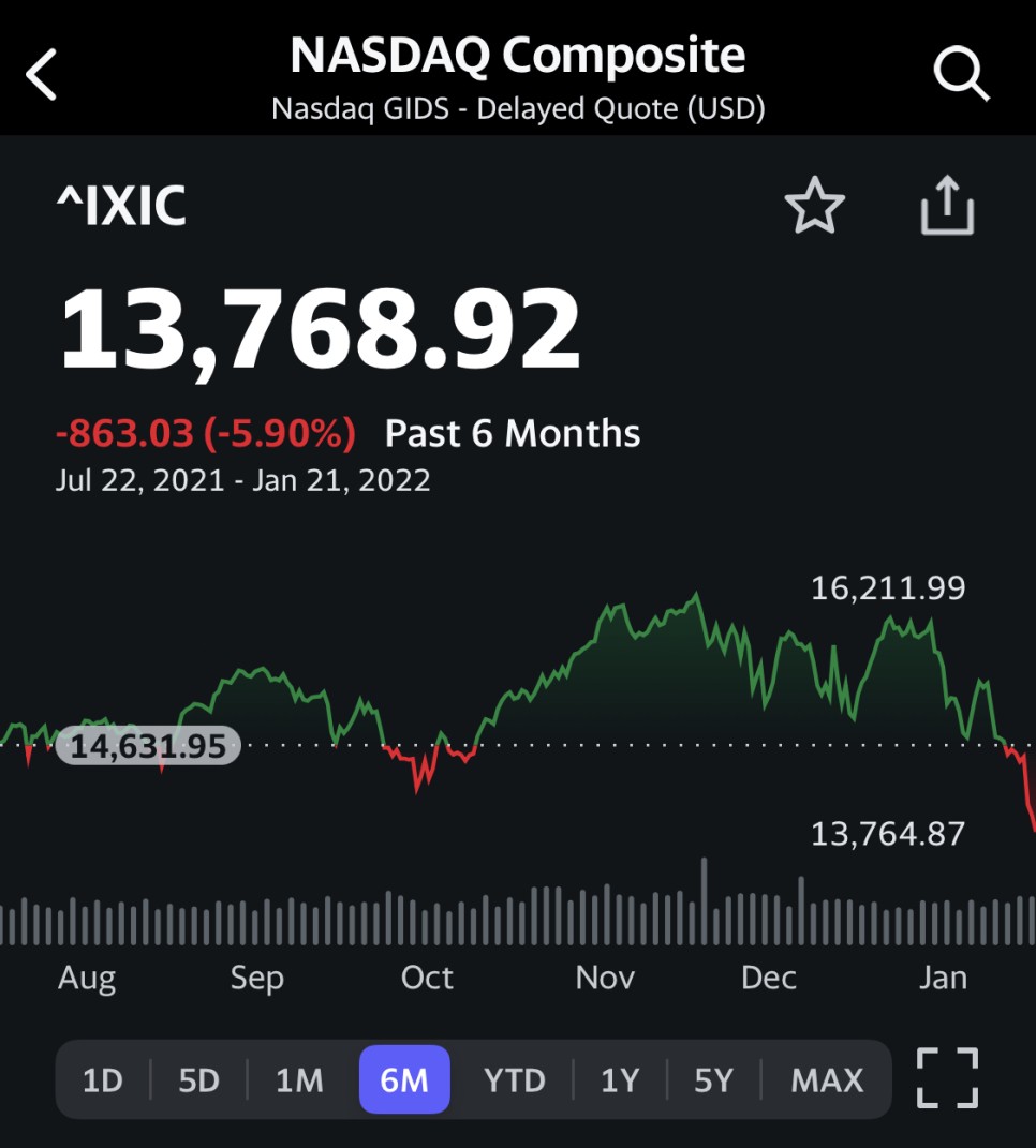 - 지난주 오전 인포스타크 이슈 점검의 대부분이 지수 하락과 관련된 내용이었다. Fed긴축과 3월 미 기준금이 인상 우려로 하락할 것이라는 게 대부분이었다. 지난주 금요일(1월 21일) 나스닥이 13768.92를 기록해 전체 고점 1621.23(11월 22일 기준)보다 15% 이상 하락했다.