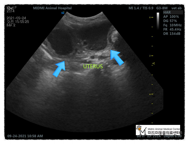 저희 병원에서 방사선, 총음파 검사 후 개의 자궁 축농증으로 진단되었습니다.