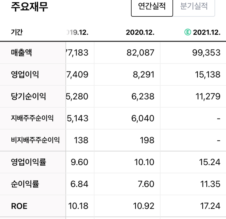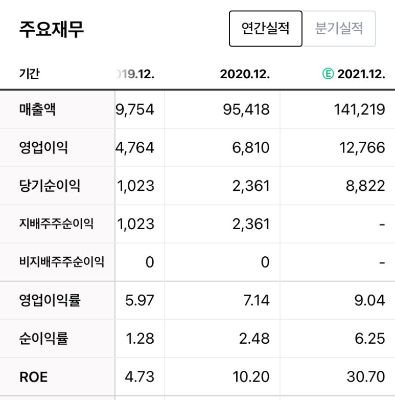 2021년 9월 전년대비 매출액 23%, 영업이익 95.8%, 당기순이익 101% 증가. 주요 매출은 스마트폰, 태블릿PC, 스마트TV 등의 고기능화 추세로 관련 부품 수요가 증가할 것으로 전망하고 자동차 시장의 제품 수요도 증가할 것으로 예상됨.