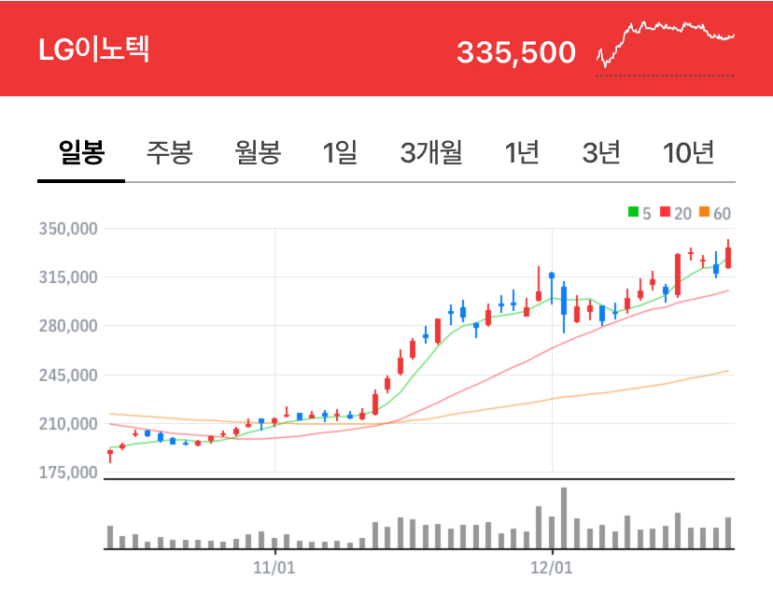 2021년 1월부터 1년간 차트를 살펴보면 실제 1월부터 11월 초까지는 주가 변동이 거의 없었고 11월 초부터 오르기 시작했다. 11월 10일 21만원대였던 주가는 12월 21일 종가 기준으로 335,500원이 된다.
