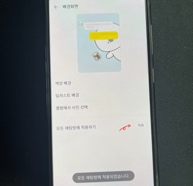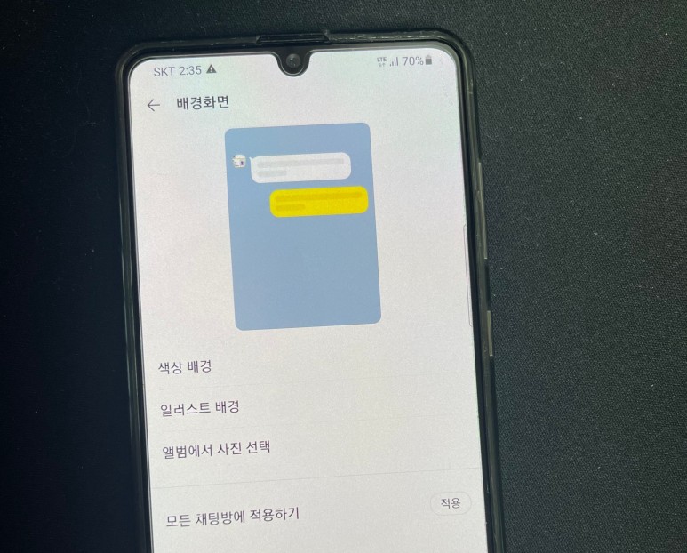 또한 자신이 선택한 이미지나 사진의 배경을 대화방에 적용하지 않고 아래 모든 곳에 적용을 한꺼번에 사용할 수도 있습니다. 나가서 확인해보니 전부 변경된걸 확인할 수 있어요.