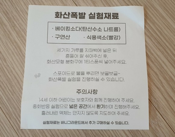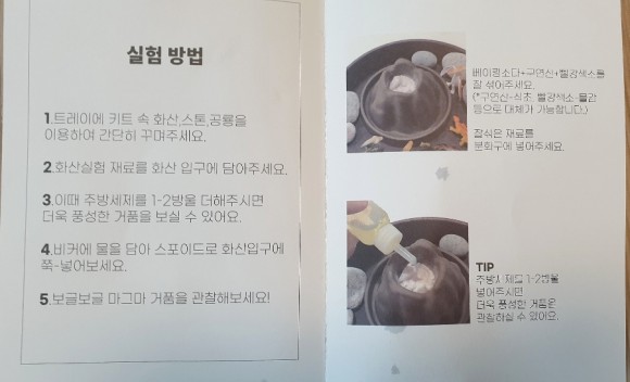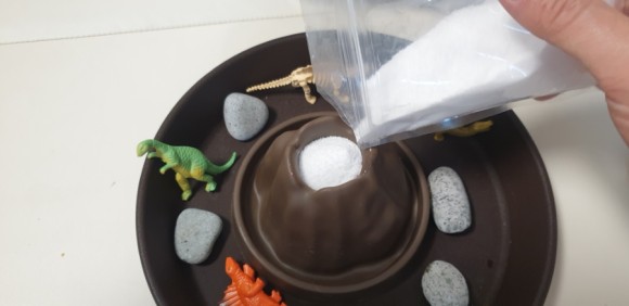 3. 화산모형에 가루/물감을 붓는 물감과 혼합된 가루를 부어 세팅을 완료합니다.