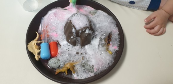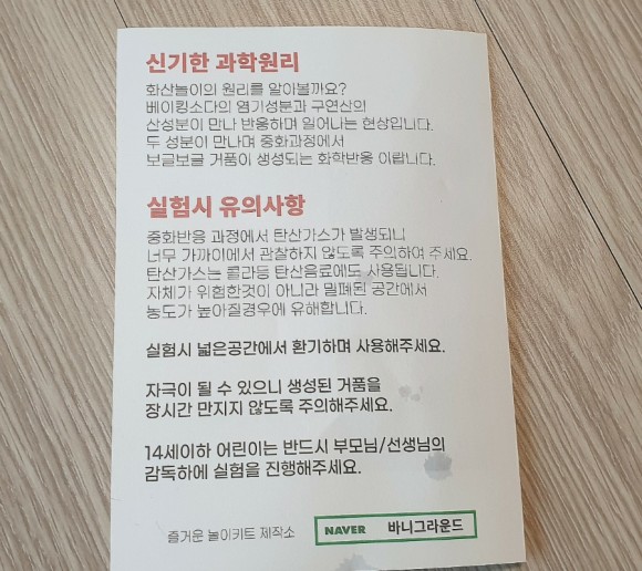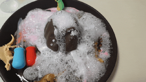화학반응을 가리켜 거품이 꺼집니다.(미리 세제를 조금 넣으면 거품이 더 잘생겼어요)