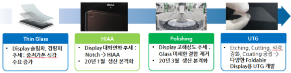 화학사업_디스플레이 사업부문=디스플레이 사업은 지난해에 이어 올해도 지속적인 성장세를 보일 것으로 전망된다. 2020년부터 본격적으로 시작된 Digital 정밀 Cutting (HIAA1)을 통해 카메라를 삽입함으로써 식각 수요도 지속적으로 증가하고 있으며, HIAA 적용 전체 공정에서의 Polishing 진행으로 디스플레이 사업은 지속적으로 성장할 것으로 기대된다. 또 OLED 패널 원가가 LCD 대비 경쟁력을 갖춰 노트북에 OLED 디스플레이 채용 수요가 급성장하면서 최근 노트북 PC용 식각 수요도 증가해 내년에도 성장세가 이어질 것으로 전망된다.