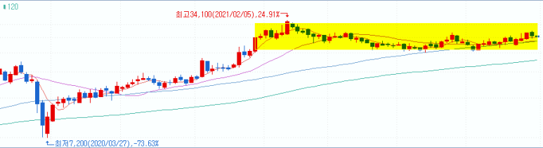 - 차트는 작년 한 해 동안 상승세를 보이다가 올해부터 박스권에 진입했다. 올해는 이런 차트가 많은 것 같다. 1년가량 이처럼 박스권에 갇혀 있으면 상승하려는 힘이 상당히 응축돼 있지 않을까 하는 기대도 한다.