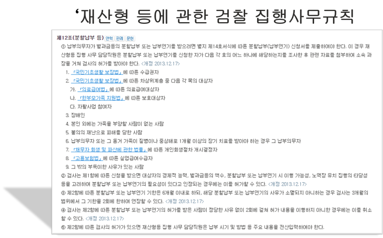 허가절차 납입명령일 30일 이내에 검찰청 민원실에 비치된 분납신청서 또는 연기신청서를 작성하고 근거자료를 첨부하여 접수하여야 합니다. 접수되면 검찰청 집행과 또는 징수과를 거쳐 담당검사의 허가 여부를 결정합니다.