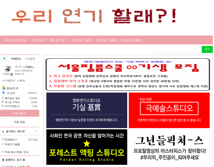 - 카페 참고 -> http://cafe.naver.com/ArticleList.nhn?search.clubid=10600351&search.menuid=542&search.boardtype ☆ L = 배우/연기자의 길을 걷는 사람들 (대본, 오디션, 프로필, 스터디.. 등) 정보나눔, 우리 연기할까?카페☆ cafe. naver.com ※ 위 카페는 12만9천명의 회원이 있는 카페입니다. 다양한 오디션 정보, 연기 대본, 연기 스터디 정보, 연기 학원 정보, 배우 프로필 정보, 매월 사진과 영상 2개의 콘테스트(상금과 상품)…. 등 많은 정보를 공유하고 있으니 관심있는 카페를 한번 둘러보시면 후회는 없으실 겁니다.^^!