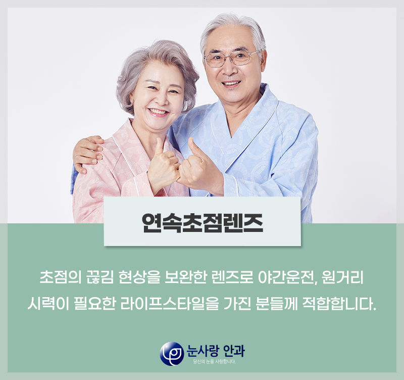이 중 4중초점렌즈는 거리 간 초점 끊김 현상이 있는데 연속초점렌즈는 이러한 현상을 보완해 일상생활에서 큰 불편을 느끼지 않는 수준까지 시력을 교정할 수 있습니다.