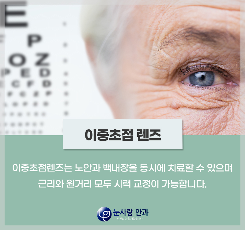 노안으로 시력이 떨어진 분은 다초점 렌즈를 삽입하여 백내장 수술과 함께 시력 교정까지 가능합니다.평소 돋보기 착용이 불편한 분들이 사용하시면 만족스러운 결과를 얻을 수 있습니다.