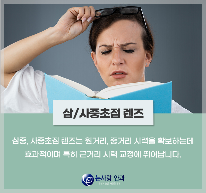 삼중, 4중 초점 렌즈는 근거리, 중거리, 원거리 시력 모두를 확보할 수 있습니다.사무직이나 독서량이 많고 근거리 시력이 필요한 분들은 3, 4중 초점 렌즈를 선택하는 것이 좋습니다.