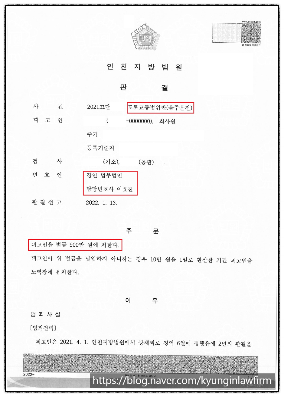 인천변호사-상해죄로 재판받던 중 음주운전 추가범행 벌금 900만원으로 종결