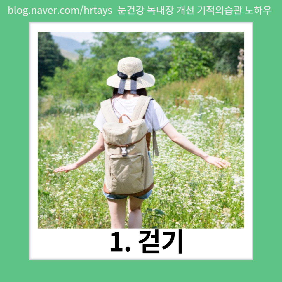 걷기는 하루에 최소 30분~1시간 빠른 걸음으로 걸으면 유산소 운동이 돼 심혈관계를 비롯한 건강 증진에 도움이 된다.바른 자세로 걸으면 척추 주위 근육이 강화돼 척추디스크 질환 예방에도 큰 도움이 된다.안압 하강과 시신경 혈류 개선을 위해서는 유산소 운동을 일주일에 5회 이상 하는 것이 좋다.야외에 나가 걷기가 힘든 날씨에는 계단을 올라가도 좋다.
