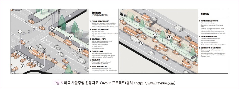 미국에서는 자율주행차 확산을 고려해 선제적으로 미시간주 디트로이트에서 언아버까지 약 40마일 구간에 자율주행 전용차로를 설치하는 Cavnue 프로젝트를 현재 진행하고 있다(그림5). 이 프로젝트는 향후 자율주행 시대에 도로가 어떻게 변화할지 예측하고 그 기술을 적용한다는 데 의미가 있다.