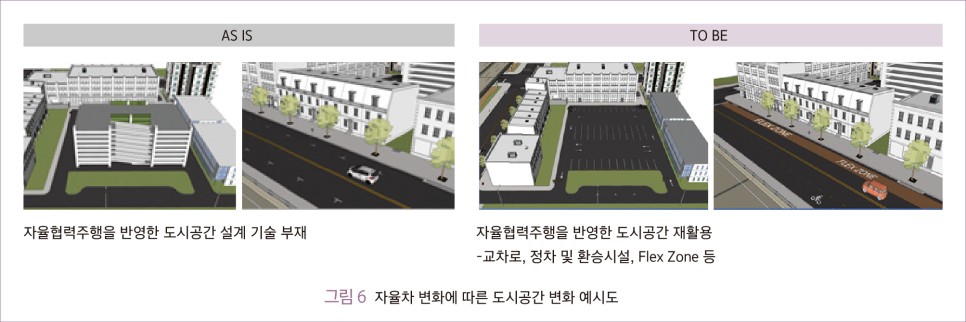 설계치 이외의 도시 가로도 자율주행 시대에 많은 변화가 있을 것으로 예측하고 있다. NACTO(2019)는 자율주행차 도입으로 주행 시 차량 간 간격 감소, 도시 내 주행 차량 대수 감소, 속도가 둔화되면서 지금보다 더 작은 도로 공간이 사용될 것으로 보고 있다. 이에 기존 도로의 여유공간은 보행자에게 더 많은 공간을 제공할 것으로 예측하고 미래 도시 가로설계 청사진을 제시했다.
