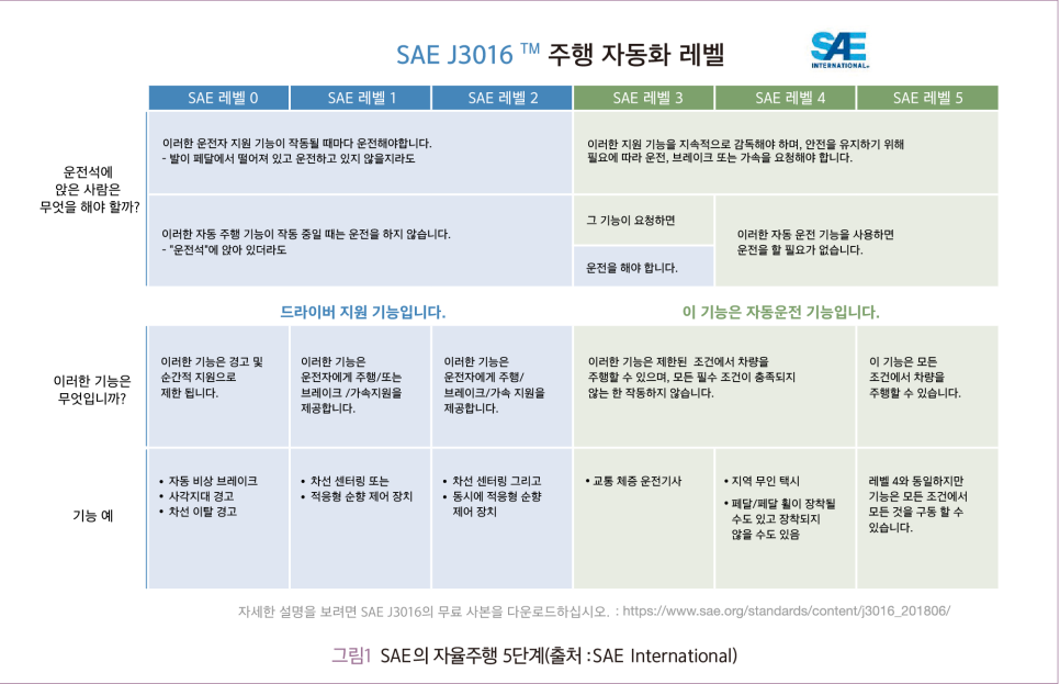 운전주체 변화 자율주행차는 운전자 없이 차량 내 시스템이 스스로 판단해 운전하는 시스템으로 그 구현 기능에 따라 단계를 구분하고 있다. 일반적으로 국제자동차기술협회(SAE International, Society of Automotive Engineer) 자율주행 5단계(그림1)를 자율주행 운전 수준으로 활용하고 있다.이 중 Level3 이상을 고도화한 자율주행 단계로 보고 Level4 이상은 완전 자율주행 단계로 고려하고 있다. 현재 대부분의 국가의 자율주행 기술 수준은 level 2~3단계에 머물고 있으며 세계적으로 Level4 수준의 완전 자율주행 기술개발 투자로 자율주행차 상용화에 집중하고 있다. 이에 따라 Level2 시장은 2027년 이후 감소하고 운전자 개입이 적은 Level3 이상의 자율주행차가 2030년 이후 지속적으로 증가할 것으로 예측하고 있다(Navigant Research, 2019).