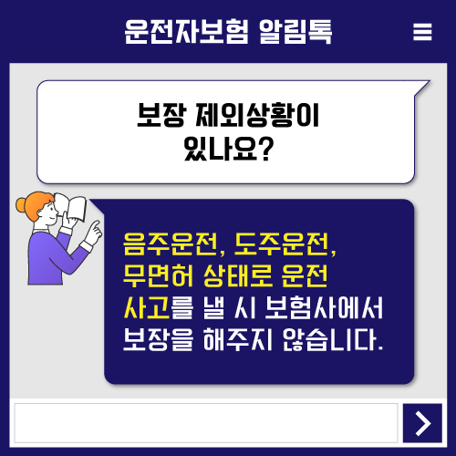 다만 여기서 주의해야 할 점은 음주운전, 무면허 등은 보험 가입이 되어 있어도 보장받지 못할 수 있습니다.