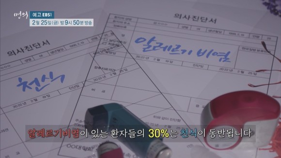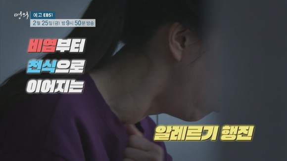 원인부터 알아내어 종합적으로 치료하라 알레르기성 비염은 알레르기 유발물질을 찾아내는 것부터 치료의 시작입니다.기본적으로 약물치료를 하지만 약물치료 외에도 알레르기 유발물질을 적극적으로 피하는 회피요법과 코세척이 큰 도움이 됩니다.천식은 최근 안정성을 높이고 좋은 효과까지 보장하는 생물학적 제제와 면역치료를 통해 증상이 현저하게 호전된 환자들이 많아졌습니다.개인마다 증상이나 원인 물질이 다양한 질환이기 때문에 적절한 생활 습관이나 치료법을 적용해야 합니다.EBS <명의 – 당신의 일상이 무너지다 알레르기 비염>에서는 알레르기 내과 전문의 조상헌 교수와 함께 다양한 사례를 보고 알레르기 비염의 원인과 치료법을 소개합니다.