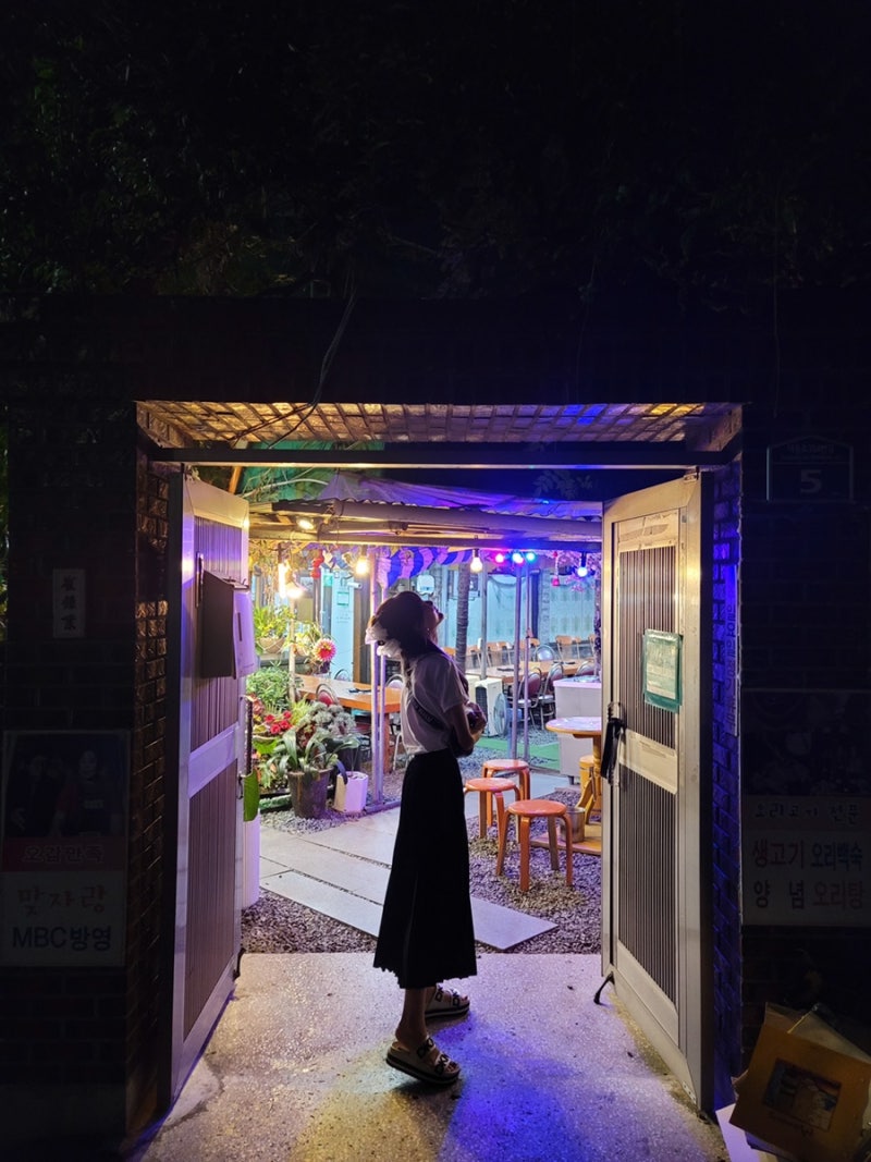 분위기 드러져 ㅋㅋㅋ 못해도 40년 넘게 운영해온 포스가 쇠밑에 자갈밭이고 의자가 쇠뭉치라서 움직이지 않는게 가장 큰 단점이에요 ㅋㅋ 절대 힘으로 자를 수 없는 시스템을 가져야해요 ㅋㅋㅋ 저기 살짝 벌어진 틈이 화장실 가는 길이에요.~오래된 곳치고는 화장실 나쁘지 않더군요! 그리고 야외에 앉으니 주류도 셀프입니다.꺼내서 드시고 나중에 계산하실 때 따로 말씀해주세요.