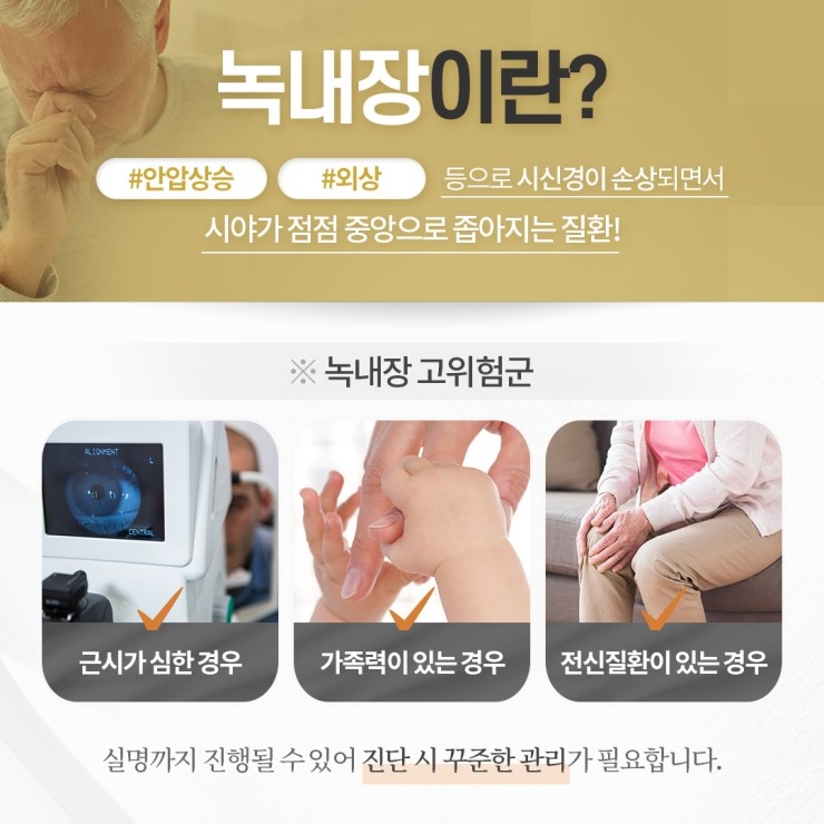 먼저 녹내장은 안압상승, 외상 등 다양한 원인으로 눈 속에 있는 시신경이 손상되고 시야범위가 점점 좁아지는 안질환을 말합니다.