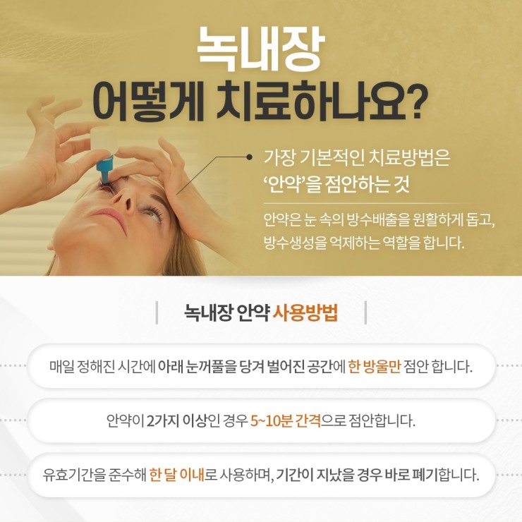 시신경 손상으로 발생하는 이 질환은 주로 안압이 상승할 때 나타나기 때문에 치료할 때 중요한 점이 바로 이 안압을 떨어뜨리는 것이 중요합니다.