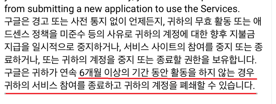 위 약관에서 보듯이 활동이 없다는 이유로 계정이 폐쇄된 경우 광고수익 잔액이 남은 경우 그 잔액을 지급받을 수 있으며, 재가입 신청을 하면 새롭게 애드센스 계정을 생성할 수 있다. 이 경우라면 이게 유튜브 채널 자체가 폐쇄되는 게 아니라 구글 애드센스 계정만 폐쇄되기 때문에 재가입을 통해 애드센스 접속을 하면 되니까 굳이 그렇게 6개월 안에 복귀하지 않아도 될 것 같은데. 근데 혹시나 하는 마음에 다들. 6개월 내에 복귀할 것으로 알려졌다.